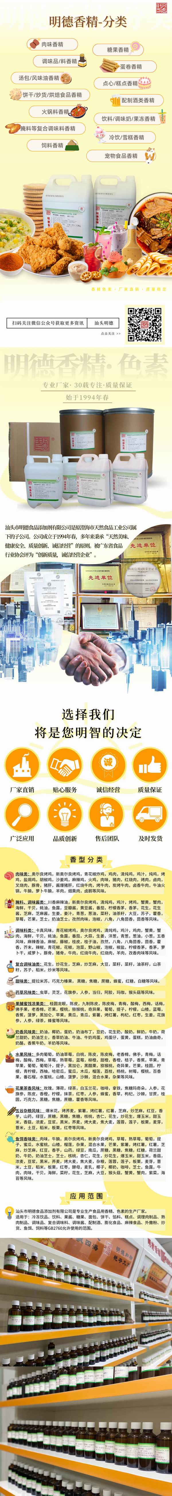 我司是生產食品用香精、食品用色素的廠家,可以為您搭配香精與色素,為您提供更好的產品解決方案,使您的產品“色香味俱全”。