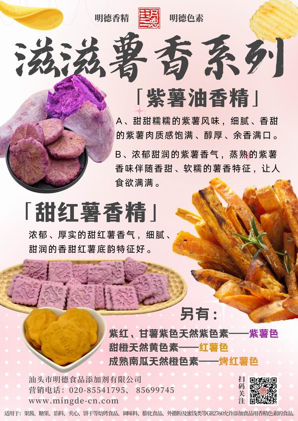 在薯味香精領域我們數十年潛心專研,迎合市場需求,滿足消費者喜好,汕頭市明德食品添加劑有限公司,推出了多種風味的番薯風味香精,如:紫薯香精、紅薯香精、烤紫薯香精、烤紅薯香精、甜紅薯香精等。