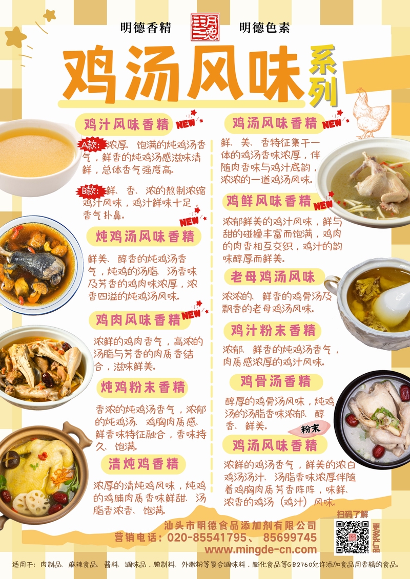 明德雞湯風(fēng)味香精 濃郁鮮香 還原地道雞湯本味汕頭市明德食品添加劑有限公司的雞湯風(fēng)味香精系列,涵蓋雞汁、雞湯、雞鮮風(fēng)味、老母雞湯、雞肉風(fēng)味、雞粉末、雞骨湯、清燉雞等多種品類。產(chǎn)品具備真實(shí)的雞肉鮮香、湯香、油香與骨香特征,能夠?yàn)獒u料、調(diào)味品、肉制品、腌制料及復(fù)合調(diào)味料等B端應(yīng)用提供穩(wěn)定、濃郁的雞湯風(fēng)味解決方案,幫助工廠快速打造風(fēng)味醇厚、回味悠長(zhǎng)的雞香產(chǎn)品。