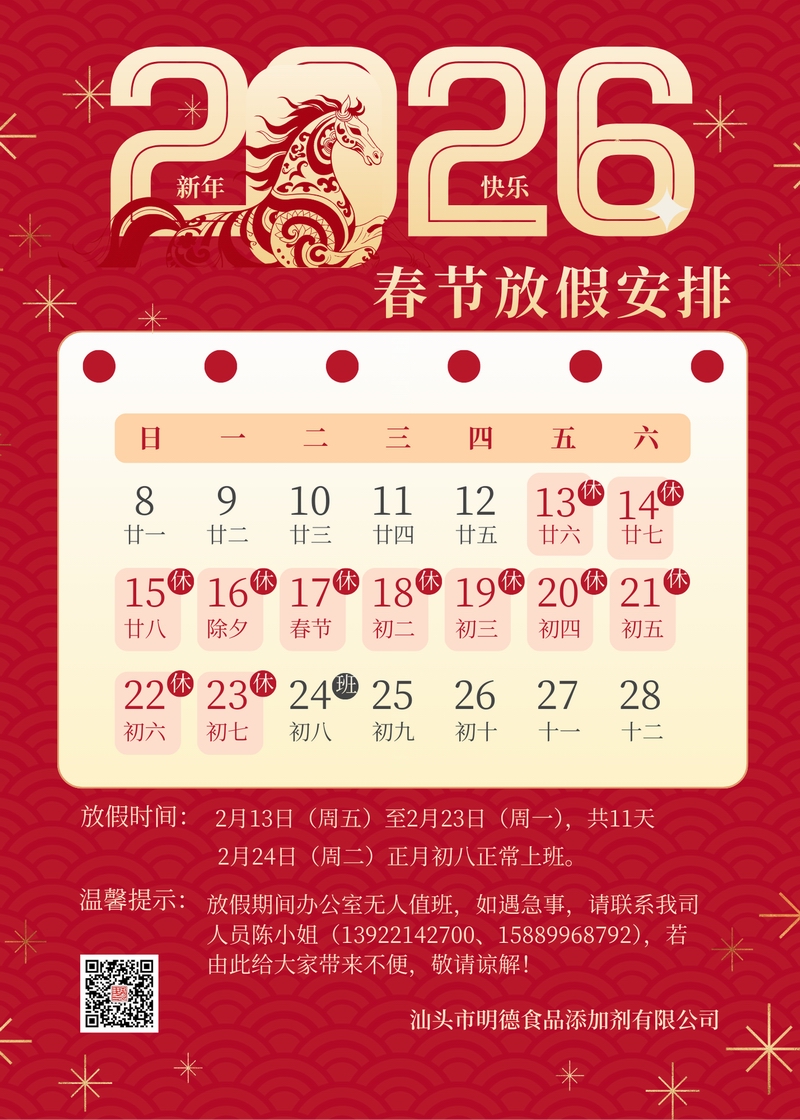 您好!新春將至,謹(jǐn)代表我司全體同仁,預(yù)祝您新春愉快、萬事順?biāo)臁?br />感謝您長(zhǎng)期以來的支持與信任,F(xiàn)有一則關(guān)于春節(jié)物流安排的重要通知,敬請(qǐng)您知悉,以便提前做好生產(chǎn)安排。